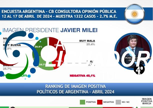 – Los políticos argentinos mejor calificados de éste mes son: Javier Milei (52.6%), Victoria Villarruel (50.7%), Patricia Bullrich (48.8%), Cristina F. de Kirchner (36.5%) y Martín Llaryora (35.2%).