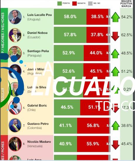 – Los tres Presidentes mejor valorados en el mes de ABRIL 2024 por sus ciudadanos son: Luis Lacalle Pou de Uruguay con 58.0% de imagen positiva, en segundo lugar quedó Daniel Noboa de Ecuador con 57.8%, y cierra éste podio Santiago Peña de Paraguay con 52.9% de aprobación.