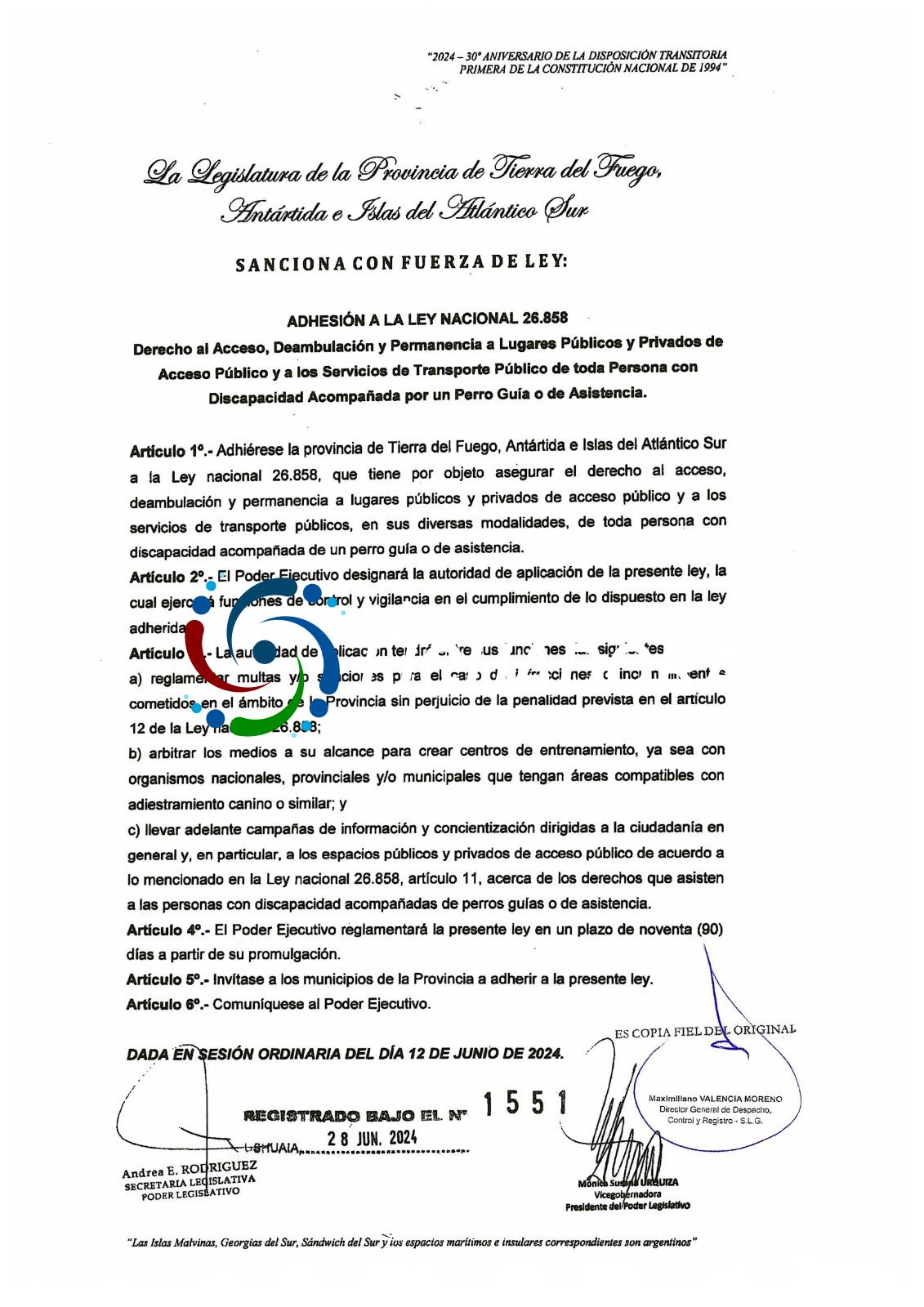 Rio Grande 29/06/2024.- En la sesión del pasado 28 de junio, la Legislatura Provincial, sancionó con fuerza de la ley la adhesión a la Ley 26.858 que da derecho al acceso, deambulación y permanencia a lugares públicos de toda persona con discapacidad, acompañada por un perro guía o de asistencia. La norma contempla multas y sanciones para aquellos que impidan su cumplimiento y el estado debe realizar campañas de concientización para su aplicación efectiva.