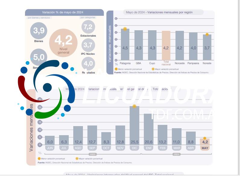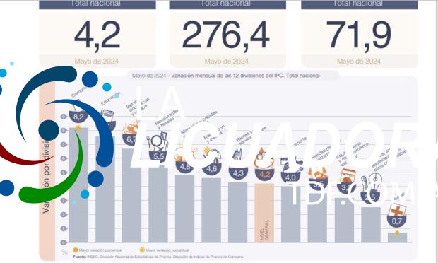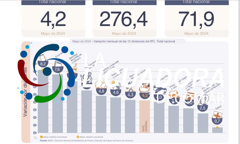 El Nivel general del Índice de precios al consumidor registró un alza mensual de 4,2% en mayo de 2024, y acumuló en lo que va del año una variación de 71,9%. En la comparación interanual, el incremento alcanzó el 276,4%.