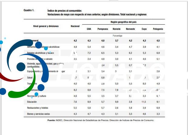 El Nivel general del Índice de precios al consumidor (IPC) representativo del total de hogares del país registró en mayo una variación de 4,2% con relación al mes anterior. Una síntesis de las variaciones de precios correspondientes a cada división de la canasta del IPC se puede observar en el cuadro 1