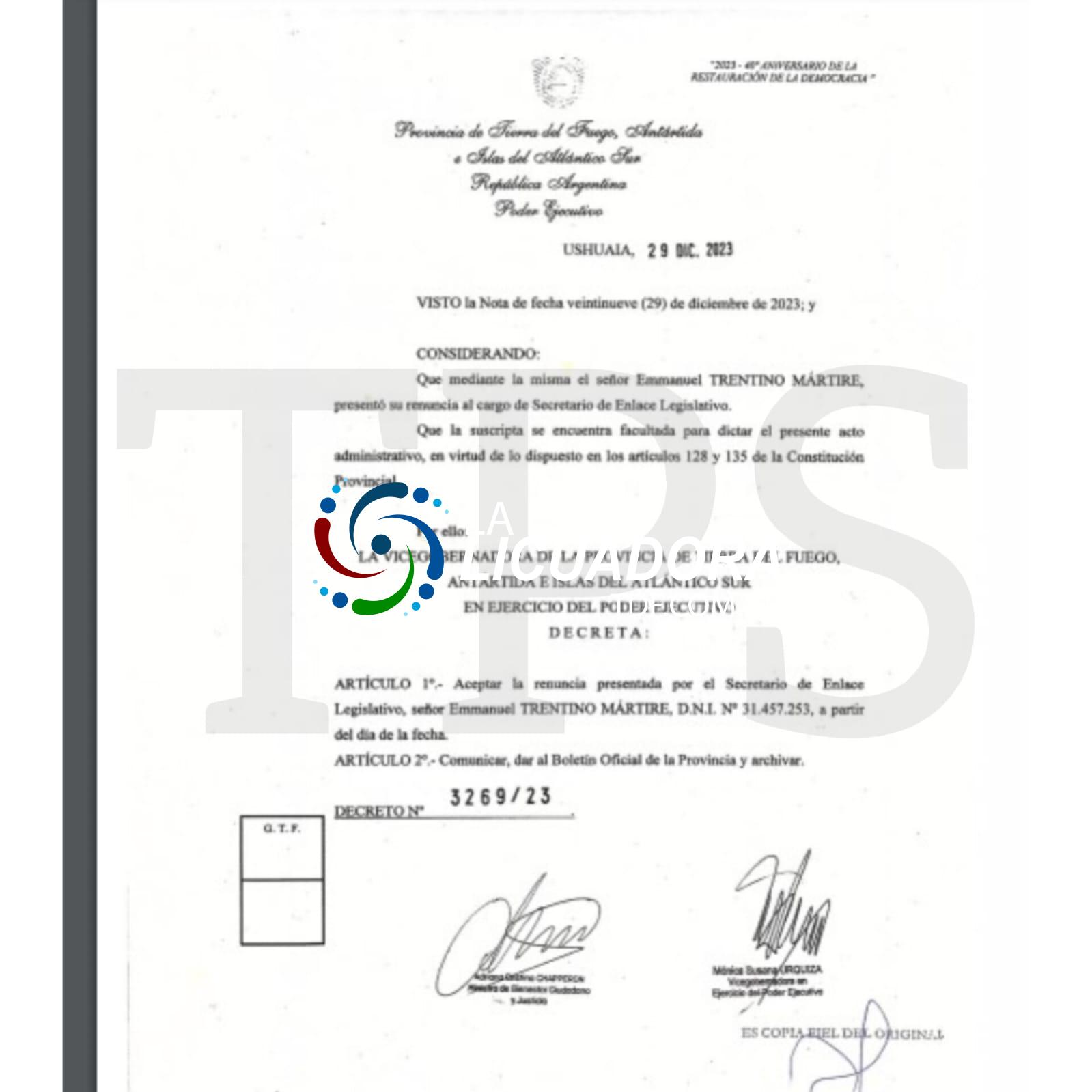 Basado en la Ley de Ministerios y en vista que el acusado Emannuel Trentino de crear un cargo ocupado por el mismo, nunca fue ocupado, por lo tanto, no habría ninguna irregularidad, en su paso a la administración publica, a la que renunció según decreto en diciembre del 2023, firmado por la Vicegobernadora Mónica Urquiza