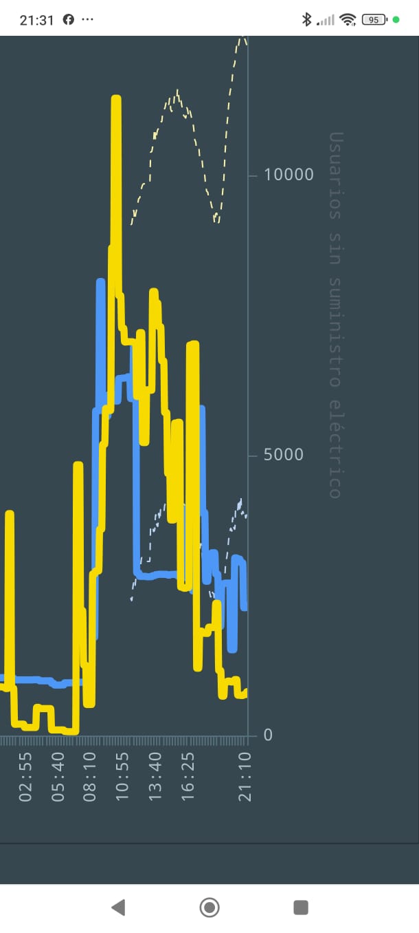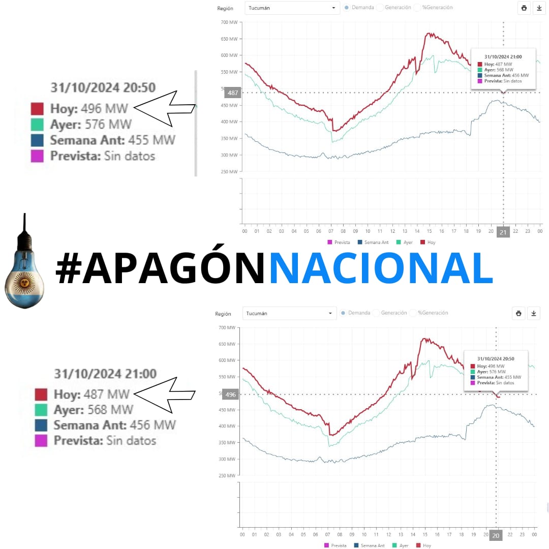 El gráfico muestra la caída, más que notable del consumo en el horario en que se dio el apagón que en algún punto redujo el consumo en más de 200MW, con respecto al día anterior.