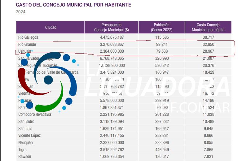 De acuerdo a los datos de los Presupuestos Municipales 2024 de 55 ciudades del país, el costo por concejal es de $129 millones anuales. Los resultados son muy dispares. Las ciudades con mayor costo son San Miguel de Tucumán y Río Gallegos con más de 600 millones en tanto que las de menor son Junín y Merlo con un importe que oscila entre 10 y 17 millones por año. Los Concejos de Rio Grande y Ushuaia aparecen entre los 10 que mas gasto insumen.