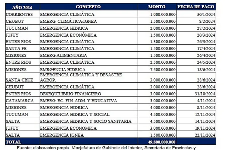 Por emergencia climática, tanto San Juan (Claudio Poggi) como Santa Fe (Maximiliano Pullaro) recibieron cada una $ 4.000.000.000. Finalmente, aparece Mendoza (Alfredo Cornejo) con un depósito de $ 3.000.000.000.
