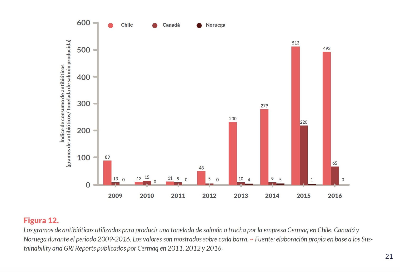 Desde el Instituto Tecnológico del Salmón, entidad que pertenece a SalmonChile, principal patronal de la industria —y que integra la famosa Cermaq— afirman: «No hay estudios científicos (al contrario que en otras especies) que evidencien una relación entre el uso de antibióticos en salmonicultura con un peligro para el entorno natural, consumidores y trabajadores».