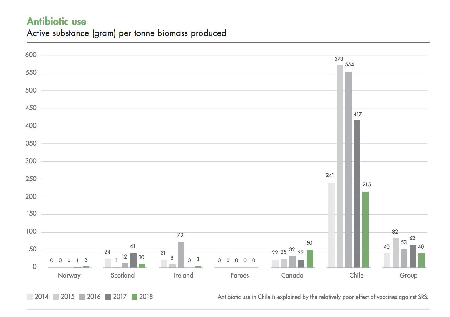 El salmón del atlántico que se produce en Chile utiliza una enorme cantidad de antibióticos comparado con el que se produce en otras partes del mundo como Canadá, Escocia y la misma Noruega, como se ve a continuación en un reporte de Mowi en que se grafica la situación.