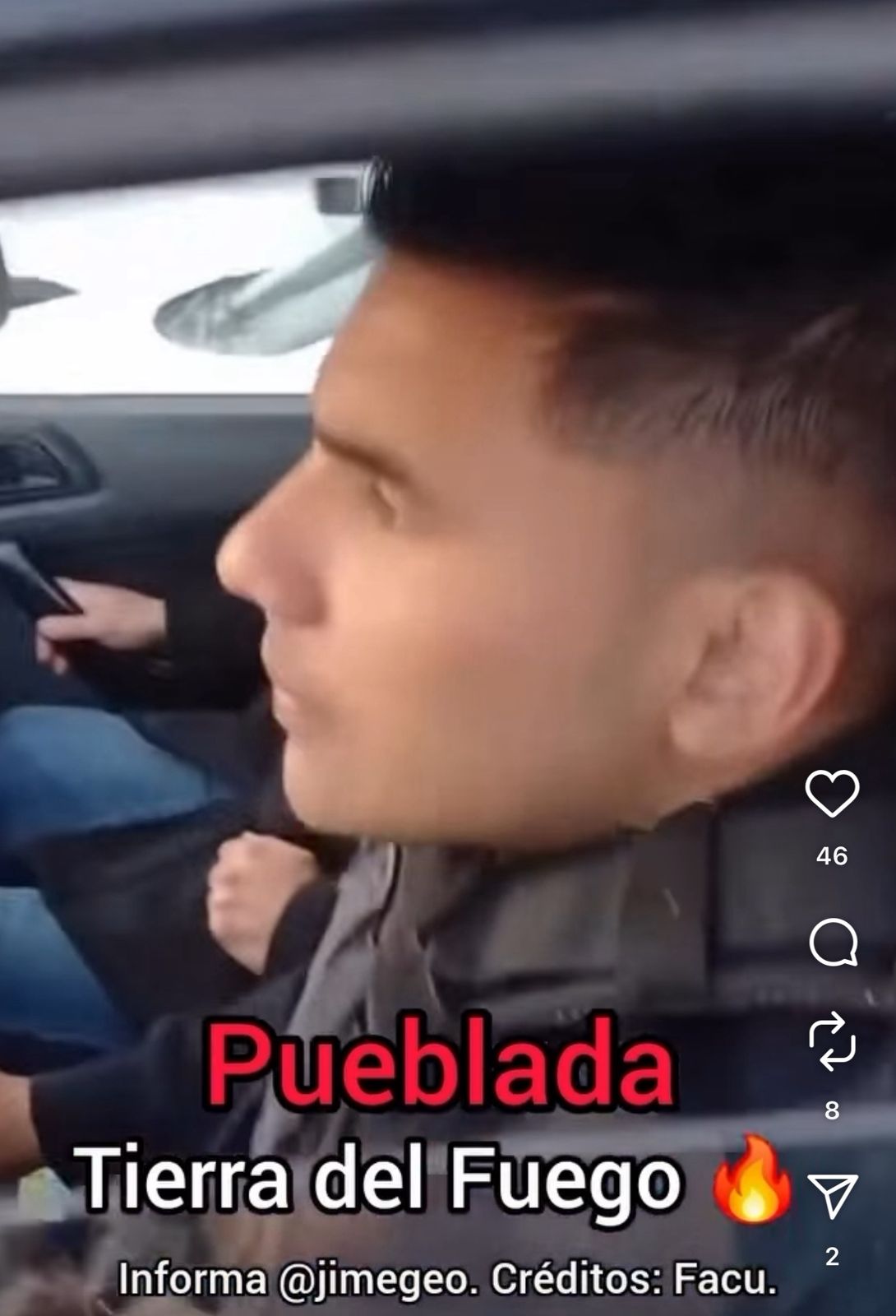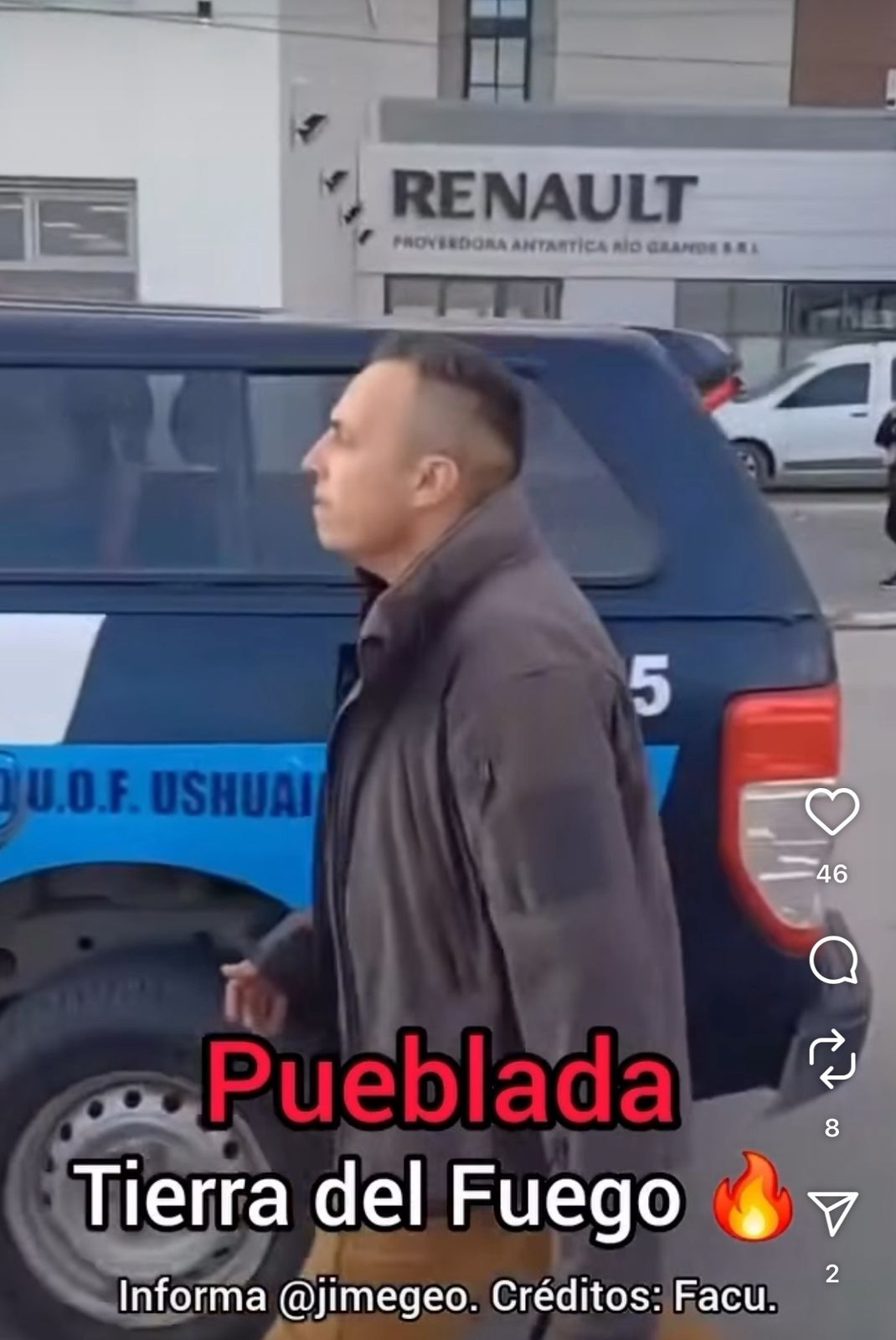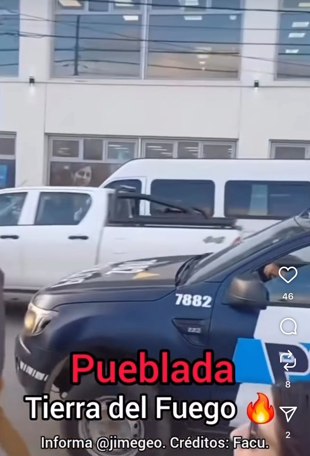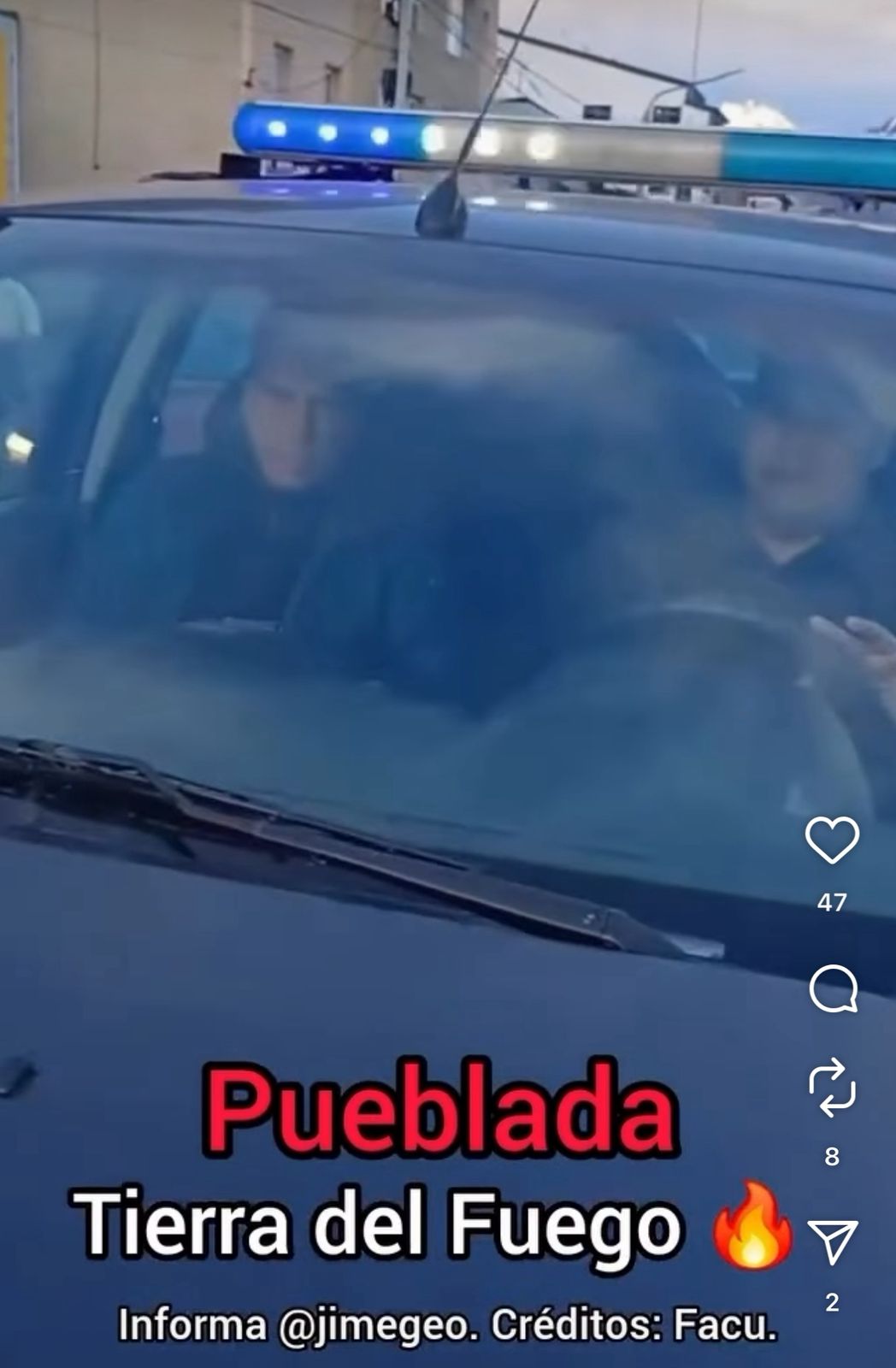 Las imágenes muestran cómo, frente a una protesta calmada, personas vestidas de civiles se bajan de vehículos oficiales de seguridad con el objetivo de mezclarse entre los vecinos fueguinos e iniciar los disturbios.