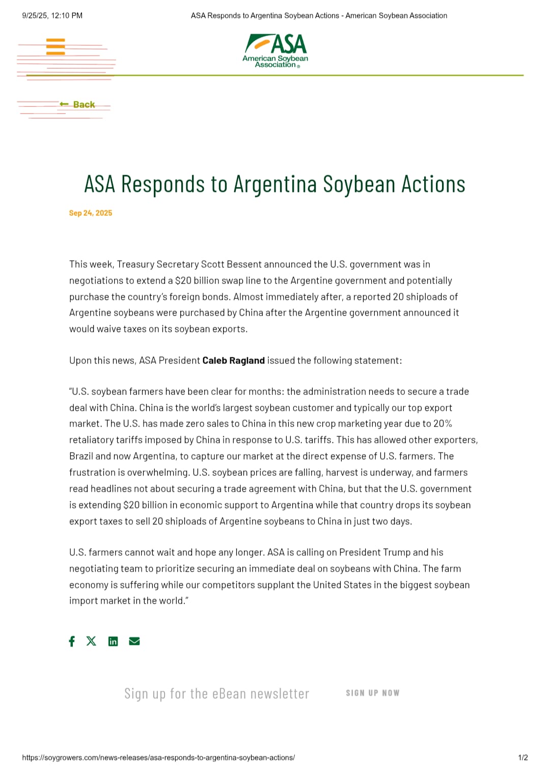 Tras esta noticia, el presidente de la Asociación Americana de la Soja (ASA), Caleb Ragland, emitió la siguiente declaración: