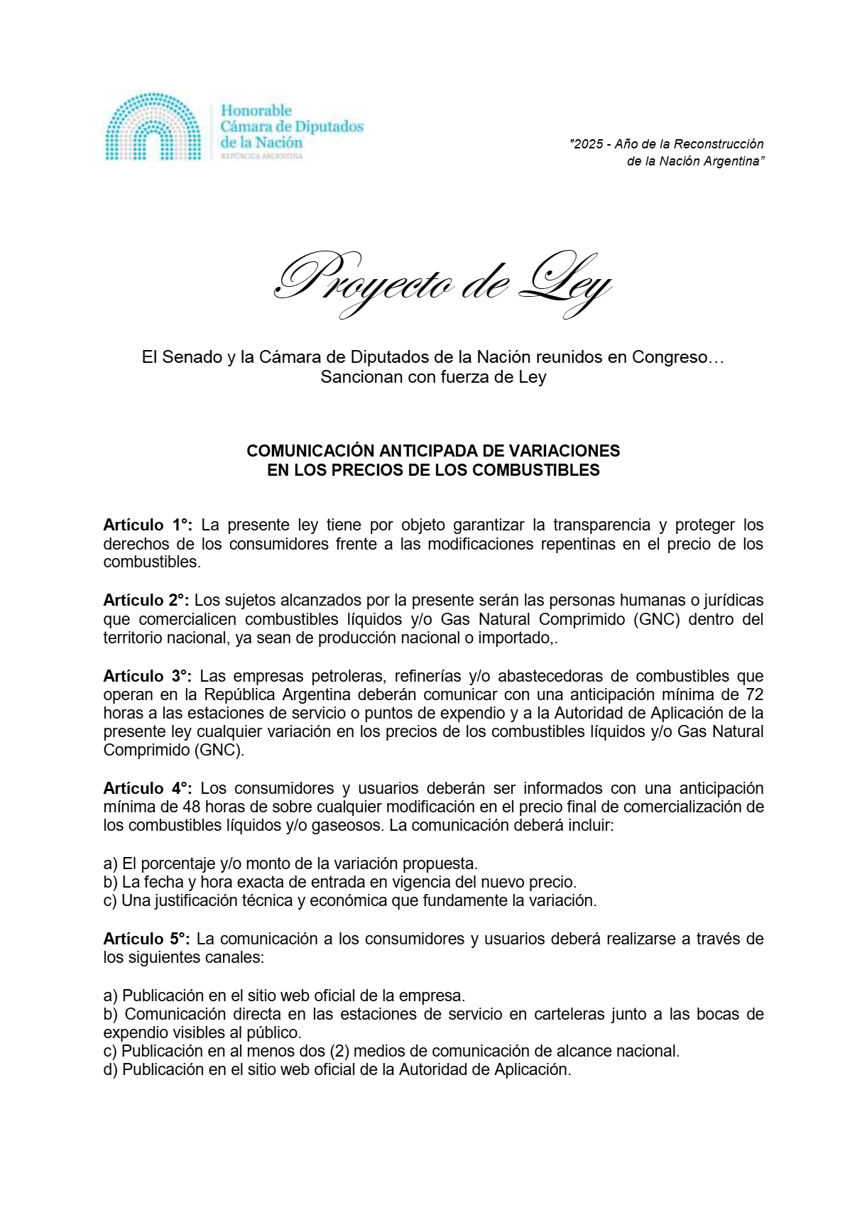 La iniciativa que ingresó a través de la Comisión de Defensa del Consumidor, establece que las empresas deberán avisar con 72 horas de antelación a las Estaciones de Servicio y a la autoridad de aplicación, mientras que los usuarios recibirán la notificación con al menos 48 horas antes de la entrada en vigor de los nuevos valores. La información deberá incluir el porcentaje del ajuste, la fecha exacta y una justificación técnica y económica.