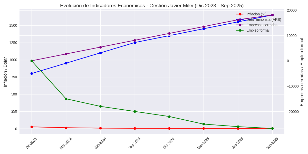 | Fecha | Inflación (%) | Dólar minorista (ARS) | Empresas cerradas (acumulado) | Empleo formal (variación mensual) |