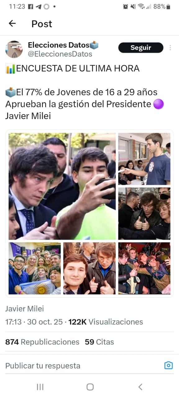 Si bien las encuestas y análisis electorales han mostrado consistentemente que Milei cuenta con un fuerte apoyo entre los jóvenes (particularmente en el grupo de menores de 25 años) en comparación con otros grupos etarios, la cifra específica del 77% no ha sido verificada con fuentes fiables en este momento. El apoyo juvenil a Milei es un fenómeno reconocido en la política argentina, pero los porcentajes varían según la encuesta y el momento en que se realiza.