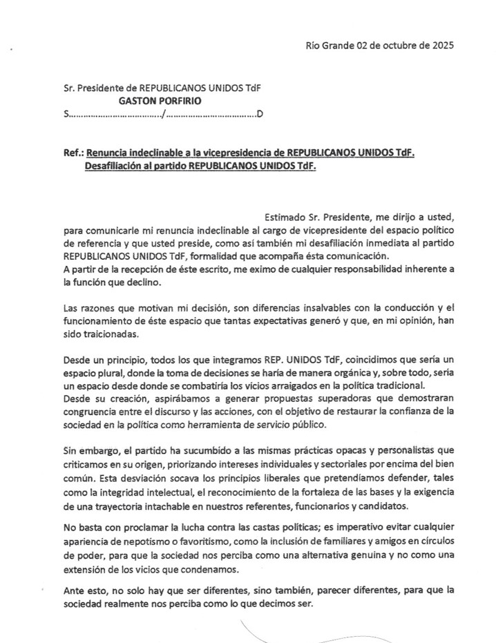 Con esta salida, se abre un nuevo capítulo en la interna de REPUBLICANOS UNIDOS en Tierra del Fuego, que deberá afrontar no solo una reconfiguración en su conducción, sino también el desafío de responder públicamente a las duras acusaciones formuladas por quien fuera uno de sus principales referentes.