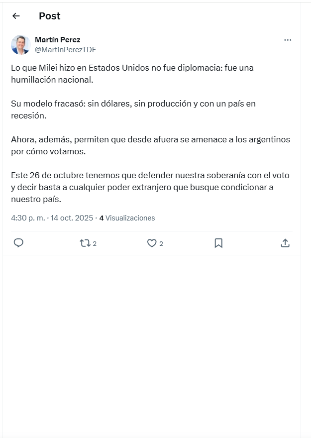 Rio Grande 14/10/2025.- Asi lo expresó el intendente de nuestra ciudad ante la Reunión de Milei, con el presidente Trump en estados Unidos. Su modelo fracasó: sin dólares, sin producción y con un país en recesión.