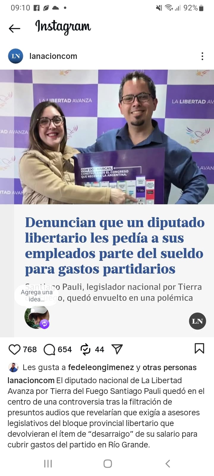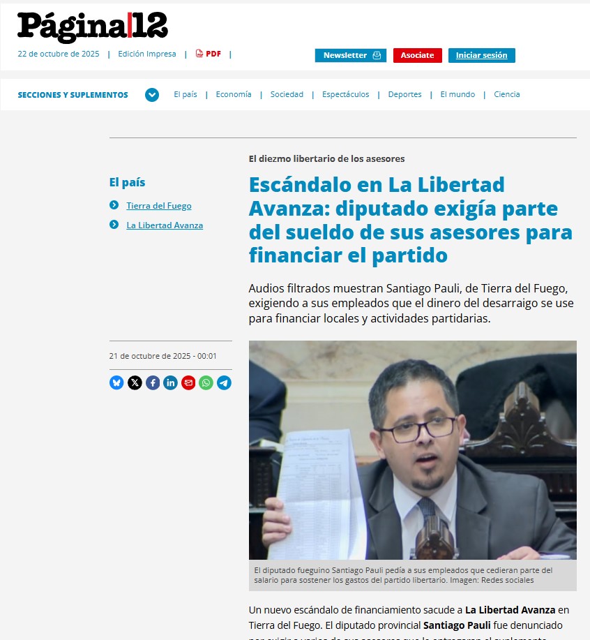 En las grabaciones, difundidas por medios nacionales, se escucha a Pauli dialogar con Rolando “Rolo” Correa, un referente libertario en Río Grande, sobre el uso del adicional por desarraigo —un viático mensual de aproximadamente $500.000 que perciben los asesores de la legislatura de Tierra del Fuego— para cubrir gastos de alquiler y mantenimiento de locales partidarios.