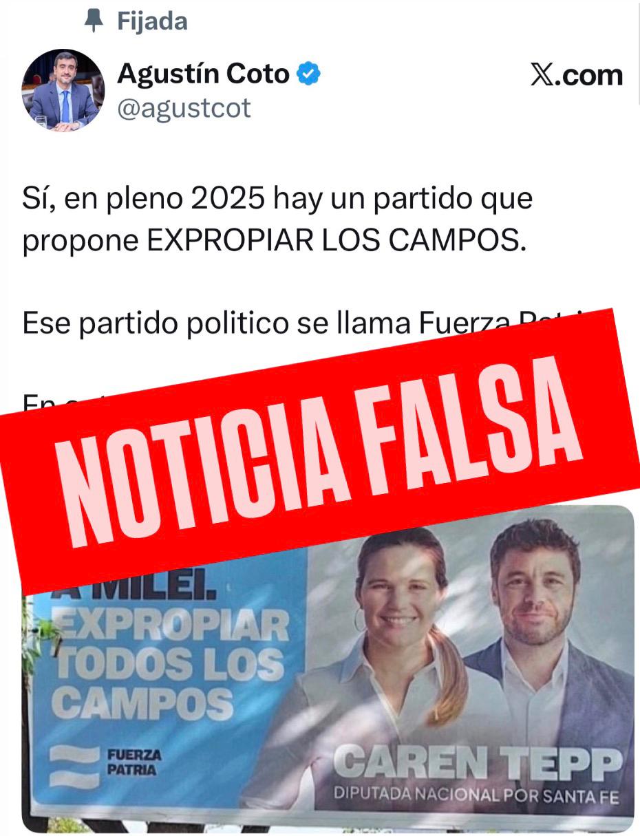 El legislador provincial y candidato a senador nacional de La Libertad Avanza por Tierra del Fuego, Agustín Coto, compartió en la red social X un afiche falso, según la cual Caren Tepp, candidata de Fuerza Patria a diputada nacional por Santa Fe, propone en su campaña la “expropiación de campos”. La publicación de Coto obtuvo como respuesta en las redes, numerosas expresiones de repudio por sumarse a una campaña sucia de noticias falsas y fake news, contra los candidatos santafecinos.