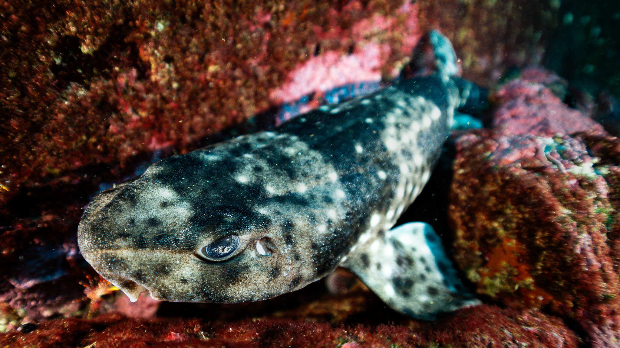 El nombre “pintarroja” viene del patrón de manchas oscuras en su dorso, que se asemejan a pintas color bordó o marrón. Es un detalle que, según Delpiani, permite identificarla fácilmente en el fondo marino. Este tiburón, conocido también como “gato” o Schroederichthys chilensis, cumple un rol clave en los ecosistemas costeros porque conecta los niveles tróficos inferiores con los superiores. Vive entre los bosques de algas donde se camufla con las rocas gracias a su cuerpo salpicado de puntos y bandas. A diferencia de otros tiburones, no es un gran migrador y pasa gran parte de su vida en cuevas y grietas del fondo marino, donde su forma alargada y flexible le permite moverse como una serpiente.