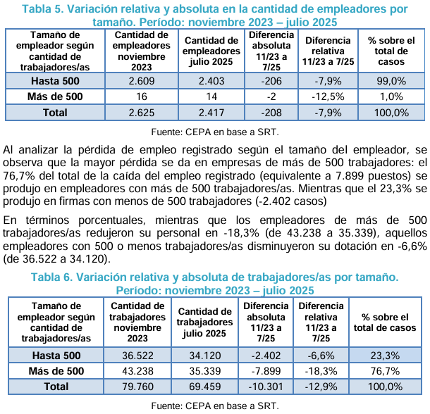 La pérdida de empleadores se concentró en empresas pequeñas y medianas, que representan el 85% de las bajas registradas. Esto evidencia una grave afectación al entramado productivo fueguino, con consecuencias que podrían prolongarse si no se implementan políticas de reactivación económica y protección del empleo.