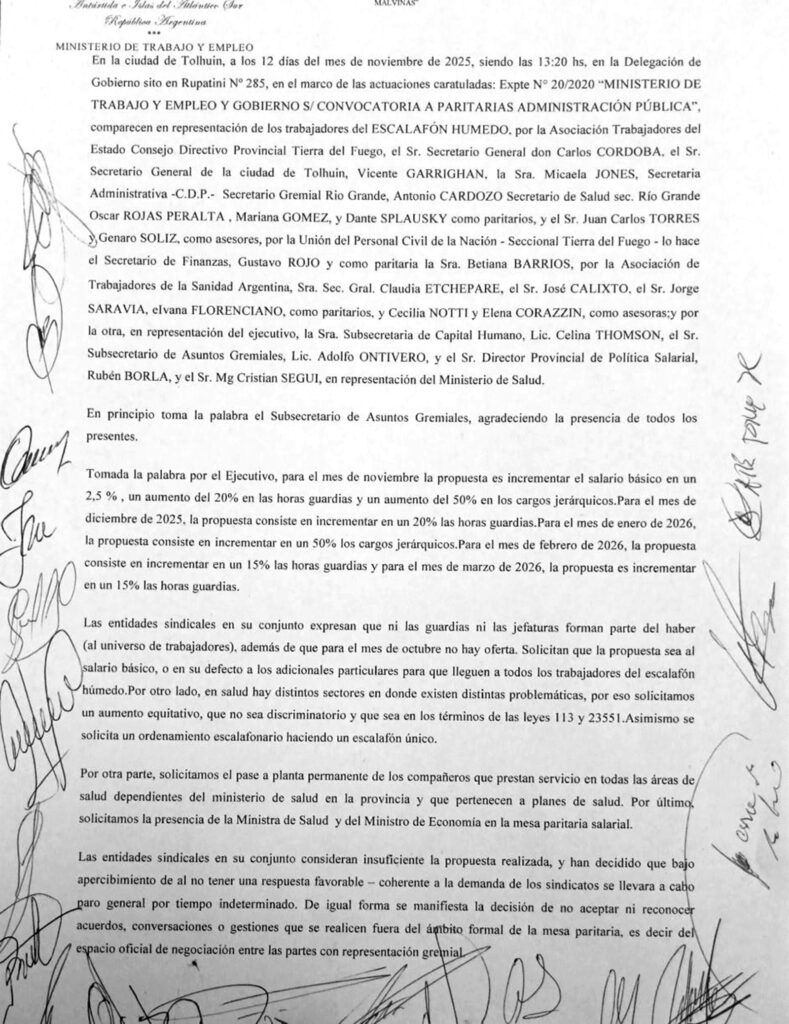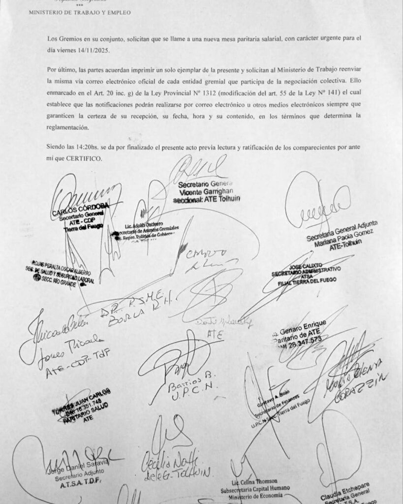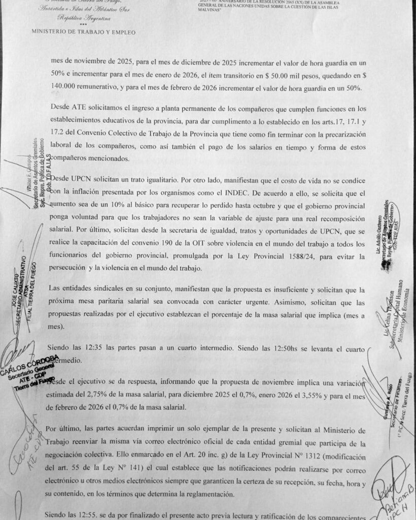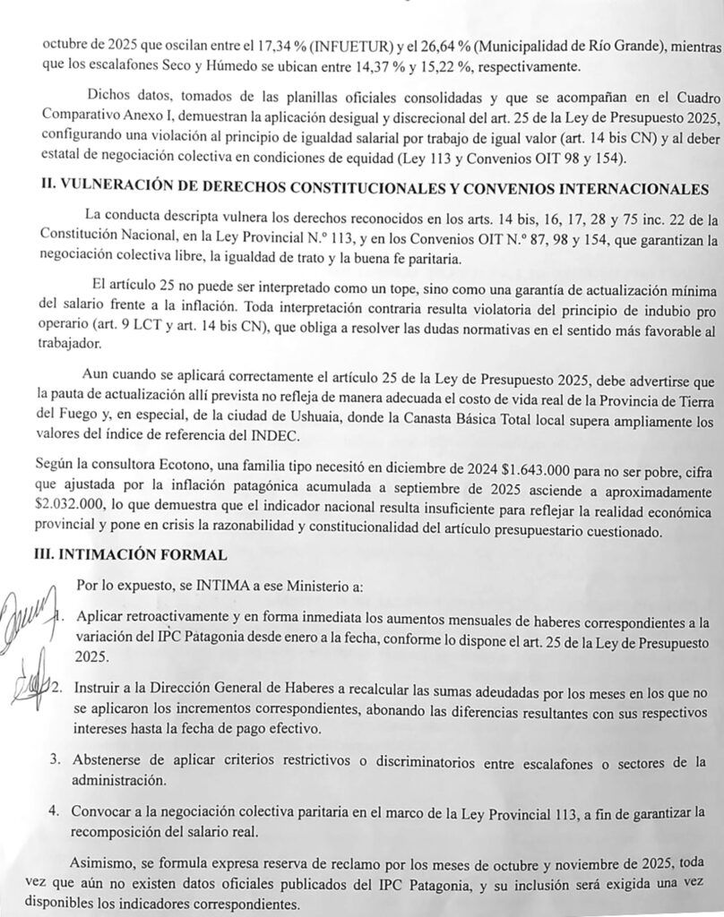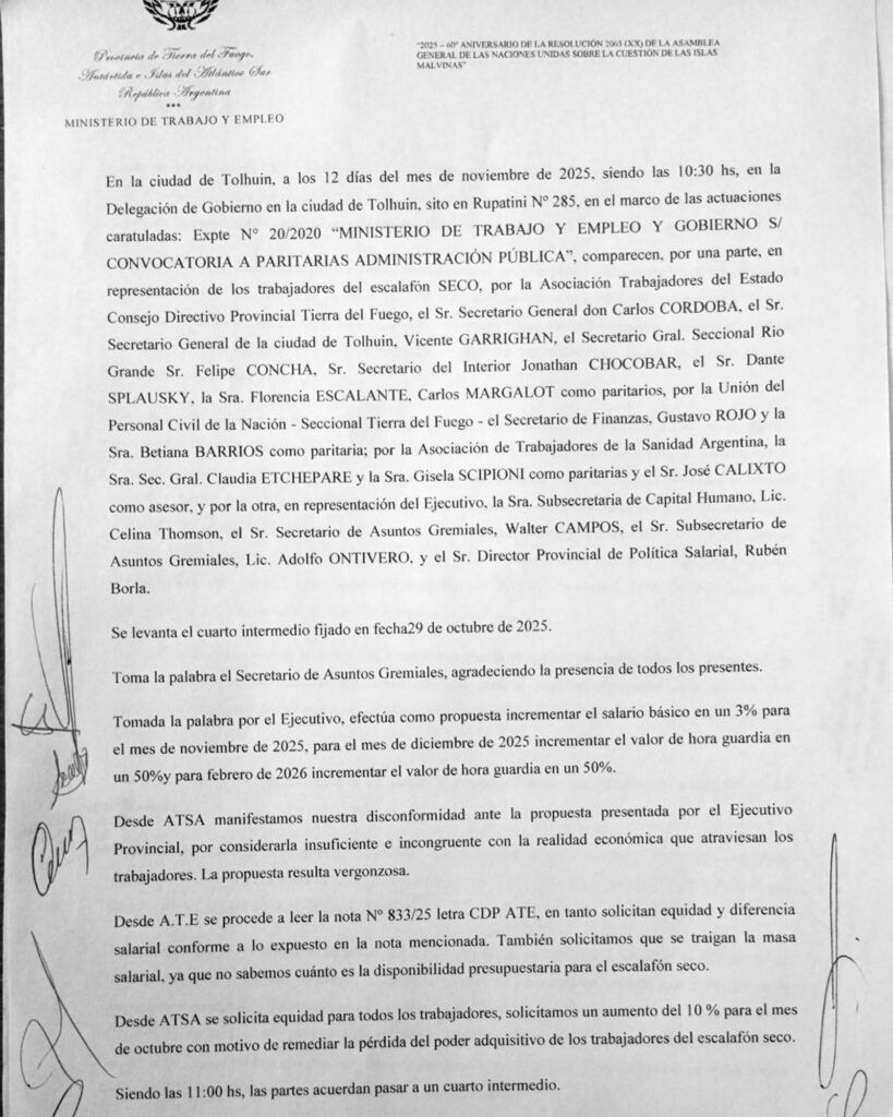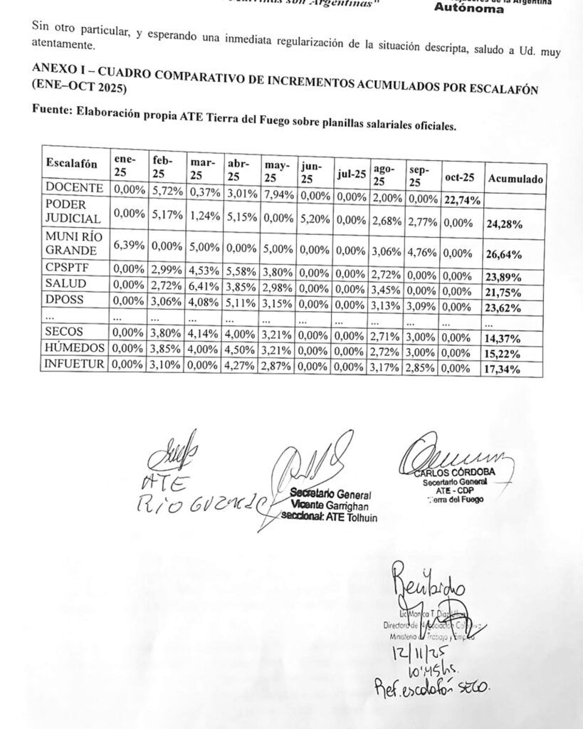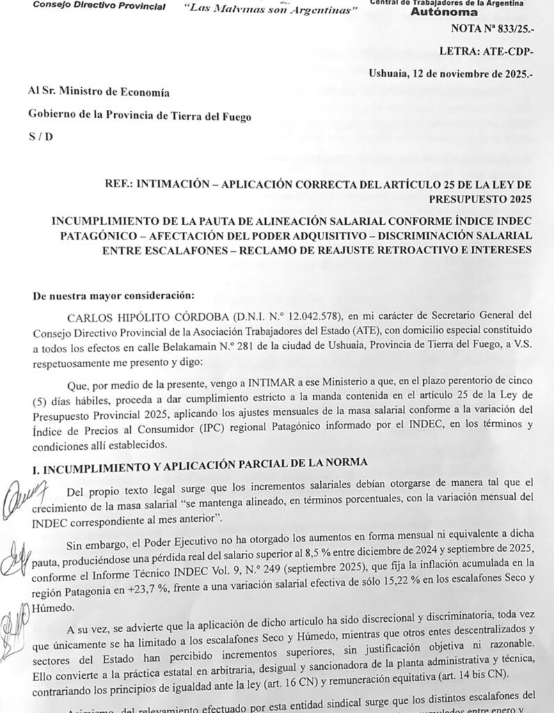 La Asociación Trabajadores del Estado (ATE) Tierra del Fuego, Antártida e Islas del Atlántico Sur participó hoy de las reuniones Paritarias de los Escalafones Húmedo y Seco de las y los trabajadores estatales fueguinos. Además, el Sindicato presentó hoy una nota formal al Ministro de Economía de la Provincia de Tierra del Fuego intimando el cumplimiento del Artículo 25 de la Ley de Presupuesto 2025 para reclamar por una correcta aplicación de la pauta de alineación salarial conforme al índice INDEC (Instituto Nacional de Estadística y Censos) patagónico, denunciando incumplimiento y aplicación parcial de la norma.