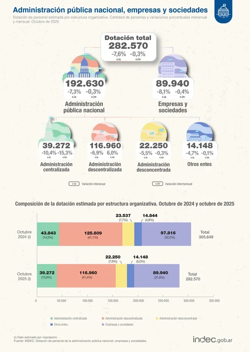 Los datos se desprenden del informe sobre dotación de personal de la administración pública nacional, empresas y sociedades que difunde mensualmente el Instituto Nacional de Estadísticas y Censos (INDEC).
