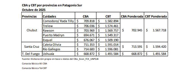 El Observatorio de Economía de la FCE UNPSJB calcula ambos indicadores basándose en precios relevados en supermercados, mostrando que la Patagonia Sur mantiene los precios más elevados en ambas canastas, confirmando el patrón reflejado en el costo del changuito.