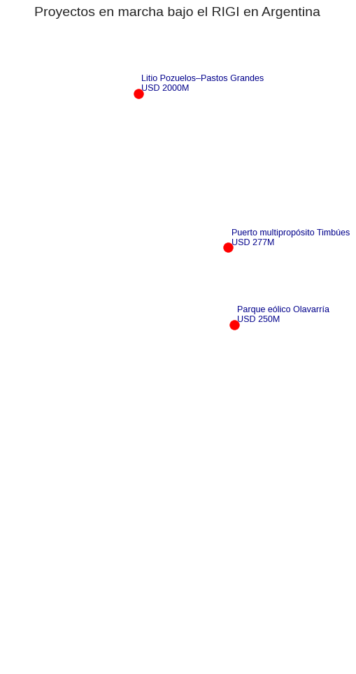 - En el primer año del RIGI ingresaron 20 proyectos por USD 34.422 millones, de los cuales varios ya iniciaron obras o cuentan con aprobación ambiental y financiera.