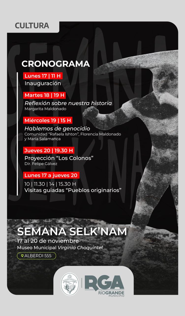 El Municipio de Río Grande, a través de la Subsecretaría de Cultura, invita a vecinas y vecinos a participar de la Semana Selk’nam, una propuesta que busca poner en valor la memoria de los pueblos originarios, promover el diálogo y profundizar el conocimiento sobre la identidad fueguina. Habrá charlas, proyecciones, muestras y visitas guiadas que conforman una programación pensada para reflexionar en comunidad.