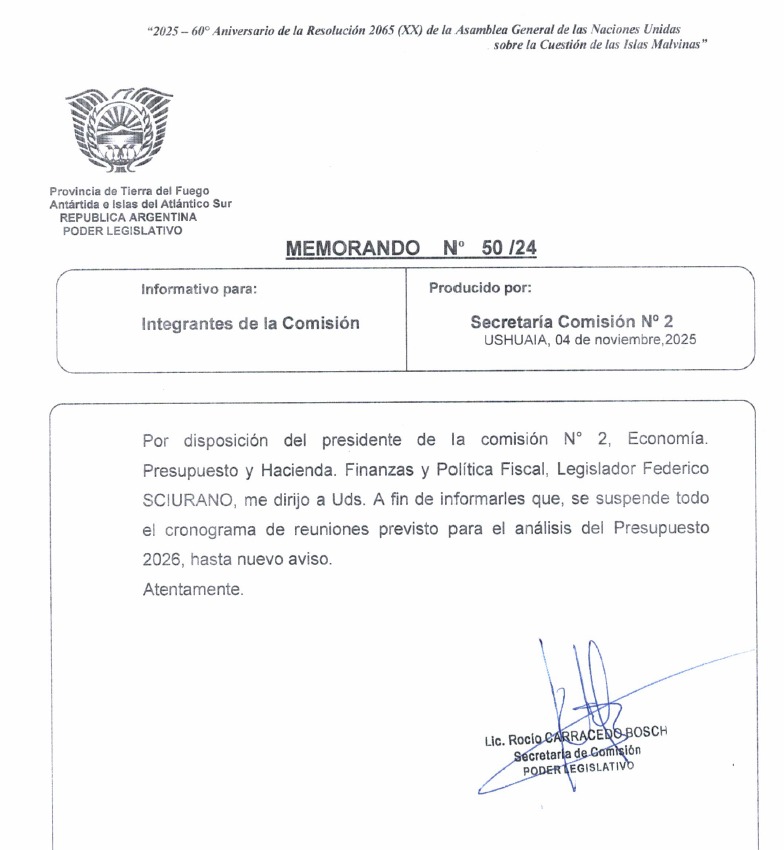Ushuaia, martes 4 de noviembre de 2025.- Desde la Dirección de Comisiones, a través de memorando interno N° 050/25, informaron que por indicación del presidente de la Comisión de Economía y Presupuesto Nº 2, legislador Federico Sciurano (FORJA), se suspende el cronograma de reuniones previsto para analizar el proyecto de Ley de Presupuesto 2026, hasta nuevo aviso.