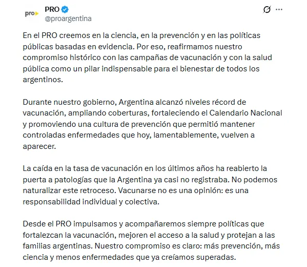 El mensaje fue difundido en la red social X, donde el partido recordó que, durante su gestión en el Gobierno nacional, “Argentina alcanzó niveles récord de vacunación, ampliando coberturas, fortaleciendo el Calendario Nacional y promoviendo una cultura de prevención”.