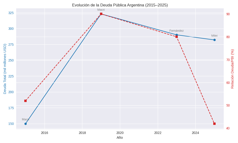 En síntesis, Luis Caputo endeudó a la Argentina en más de USD 150.000 millones entre emisiones de bonos y el préstamo del FMI durante la gestión de Macri, lo que disparó el ratio deuda/PBI y dejó una pesada carga financiera para los gobiernos siguientes