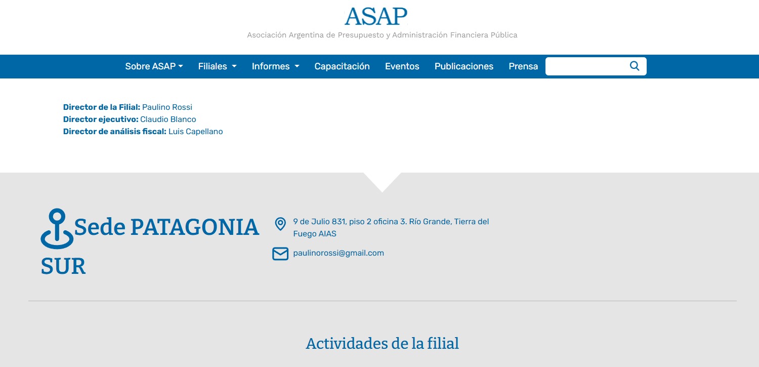 La filial de la ASAP en Patagonia Sur tiene sus oficinas en Rio Grande Av. 9 de Julio 831 piso 2 oficina 3, pero, casualmente no ha presentado ningún informe sobre la situación fiscal de la provincia a pesar del brutal recorte de ingresos de origen nacional y Rossi, ha llegado a calificar a Tierra del Fuego, como una provincia socialista, quizá este apego a las políticas de derecha, hagan que los informes sobre el daño ocasionado por Milei a nuestra provincia se retrasen en su aparición.