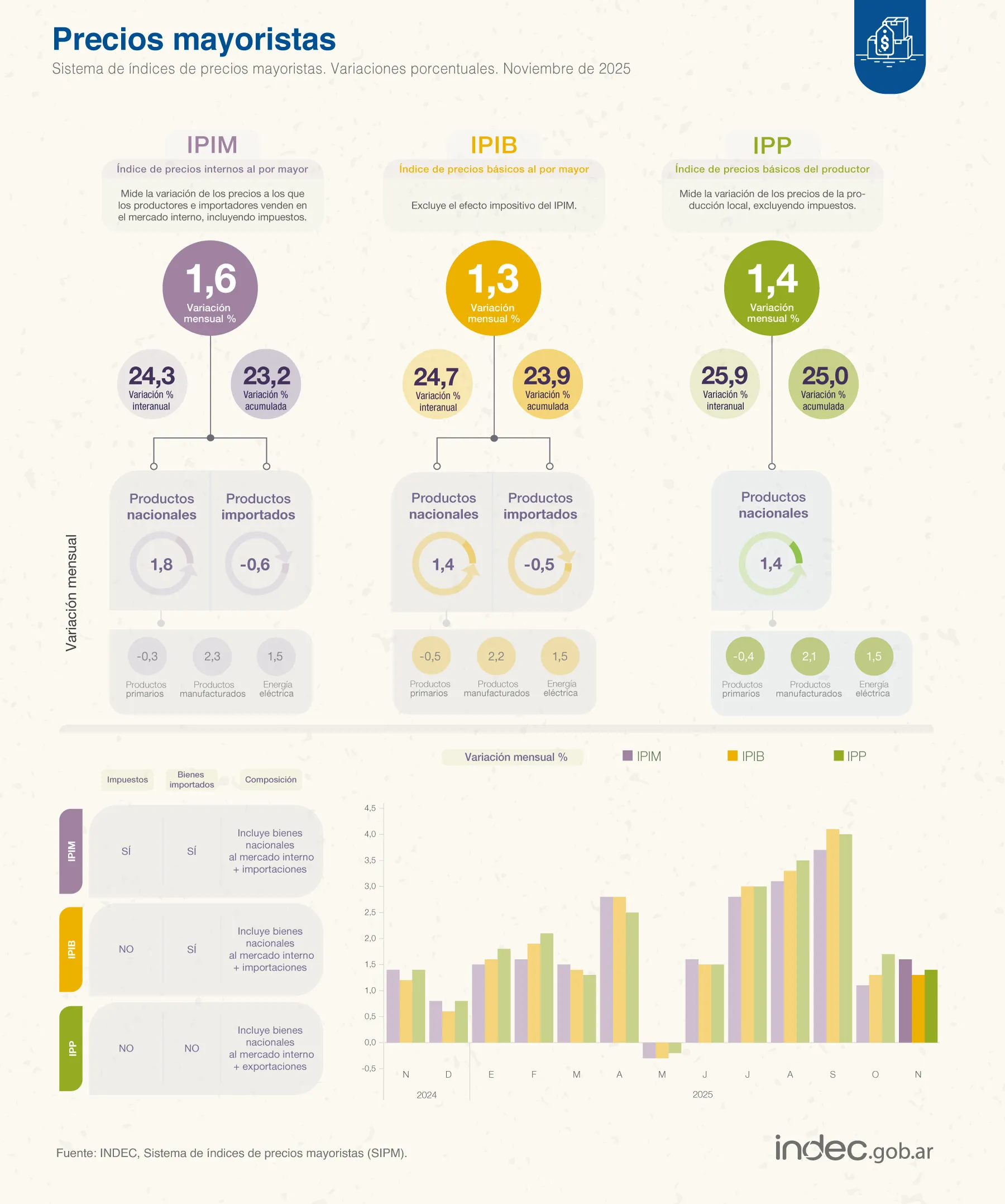 El Índice de Precios Internos Básicos al por Mayor (IPIB) registró en noviembre un aumento de 1,3%, con subas del 1,4% en productos nacionales y una baja del 0,5% en importados. En tanto, el Índice de Precios Básicos del Productor (IPP) avanzó 1,4%, con una caída del 0,4% en productos primarios y subas del 2,1% en manufacturas y energía eléctrica.