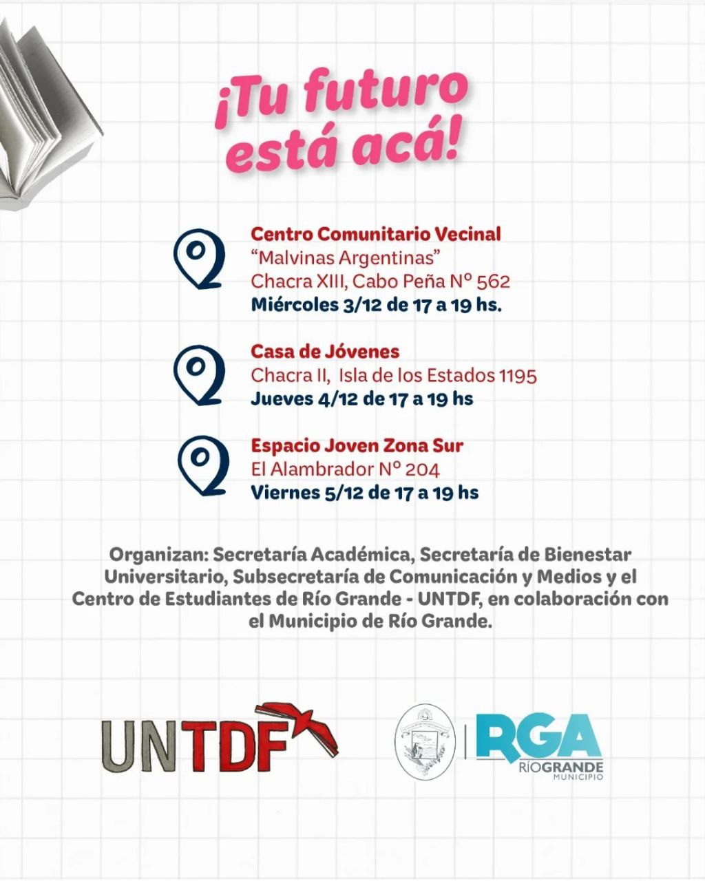 Durante cada encuentro se habilitarán puntos de preinscripción y orientación universitaria para todas las personas interesadas en comenzar sus estudios en 2026. Los equipos brindarán información sobre la oferta académica de la UNTDF, los requisitos de ingreso, los programas de acompañamiento y todo lo necesario para ayudar a las y los estudiantes a elegir su carrera y completar el proceso de preinscripción.