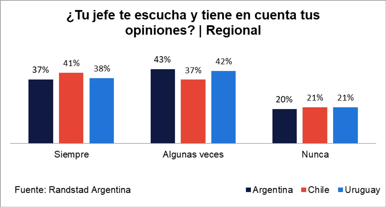 El 37% de los argentinos afirma que su jefe siempre lo escucha y tiene en cuenta sus opiniones, mientras el 43% asegura que ocurre solo a veces y un 20% dice que su jefe nunca le pidió su opinión. En comparación, los trabajadores chilenos son quienes más se sienten escuchados (41%), seguidos por los uruguayos (38%) y luego los argentinos (37%).