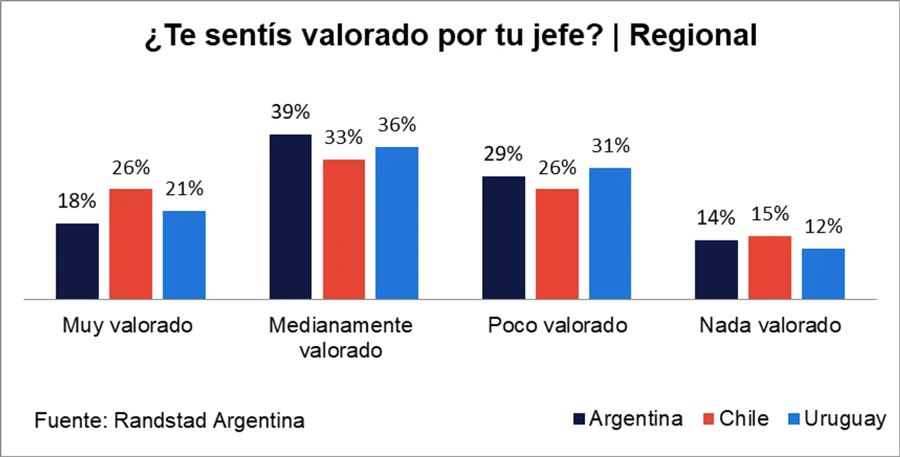 A nivel regional, los empleados chilenos encabezan el ranking con un 59% que dice sentirse valorado, seguidos por los argentinos (58%) y los uruguayos (57%). Andrea Avila, CEO de Randstad para Argentina, Chile y Uruguay, remarcó que sentirse valorado “es un elemento clave que da forma al ambiente laboral, uno de los intangibles más importantes a la hora de atraer y comprometer al talento”.