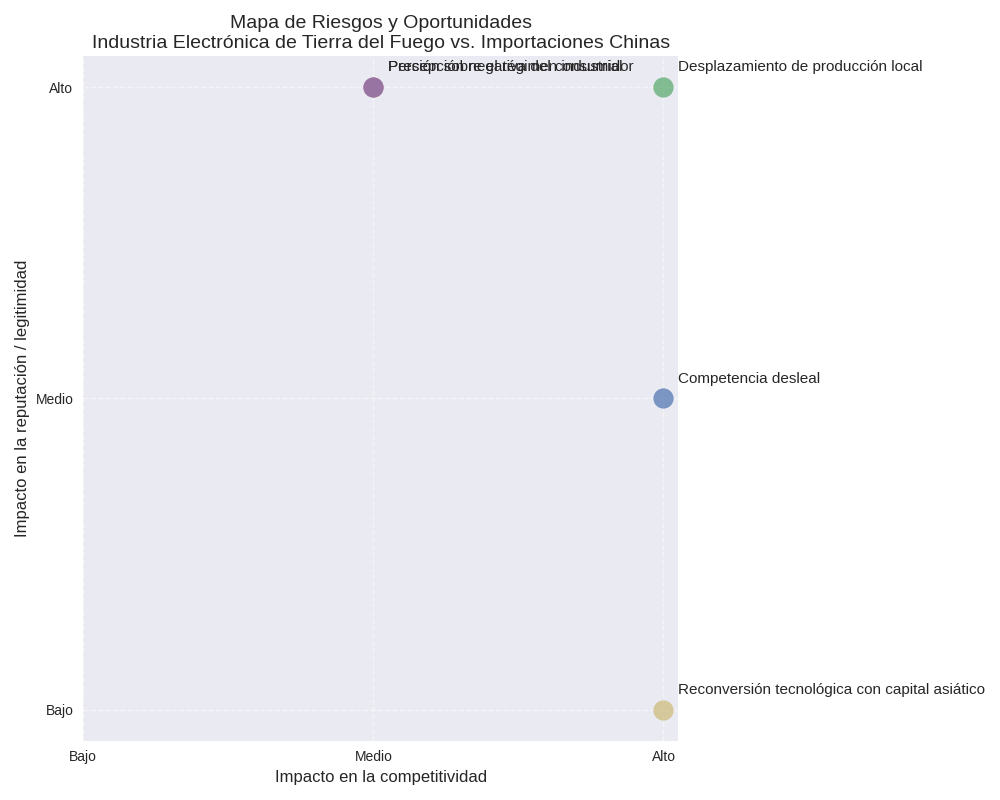 Con el mapa de riesgos y oportunidades ya armado, lo que tenemos es una herramienta visual y estratégica para explicar cómo las importaciones chinas de baja calidad afectan a la industria electrónica fueguina en dos frentes: