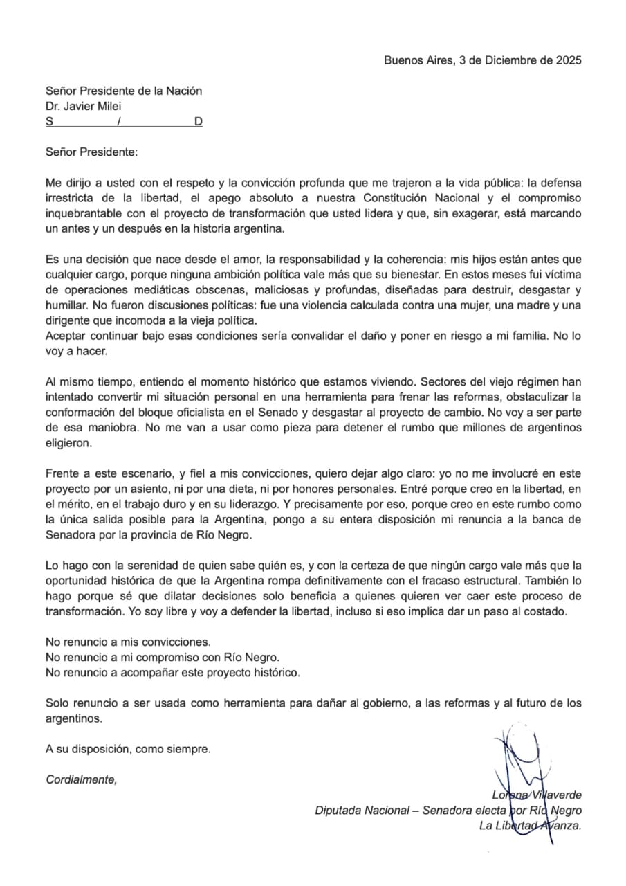 Rio Grande 04/12/2025.- La renuncia de, Lorena Villaverde quien debía asumir su banca en el Senado de la Nación es uno mas de los actos vergonzosos de la política argentina que nos toca vivir. La excusa de no asumir para que «no sea utilizada como herramienta para dañar al gobierno, las reformas y el futuro de los argentinos» es por lo menos la confirmación de que esta mas sucia que una papa y aun asi seguirá en diputados y en el entorno de Milei y Karina, su hermana. Es de suponer que la justicia actué con la celeridad que la caracteriza cuando se trata de delitos de los opositores al gobierno nacional de turno.