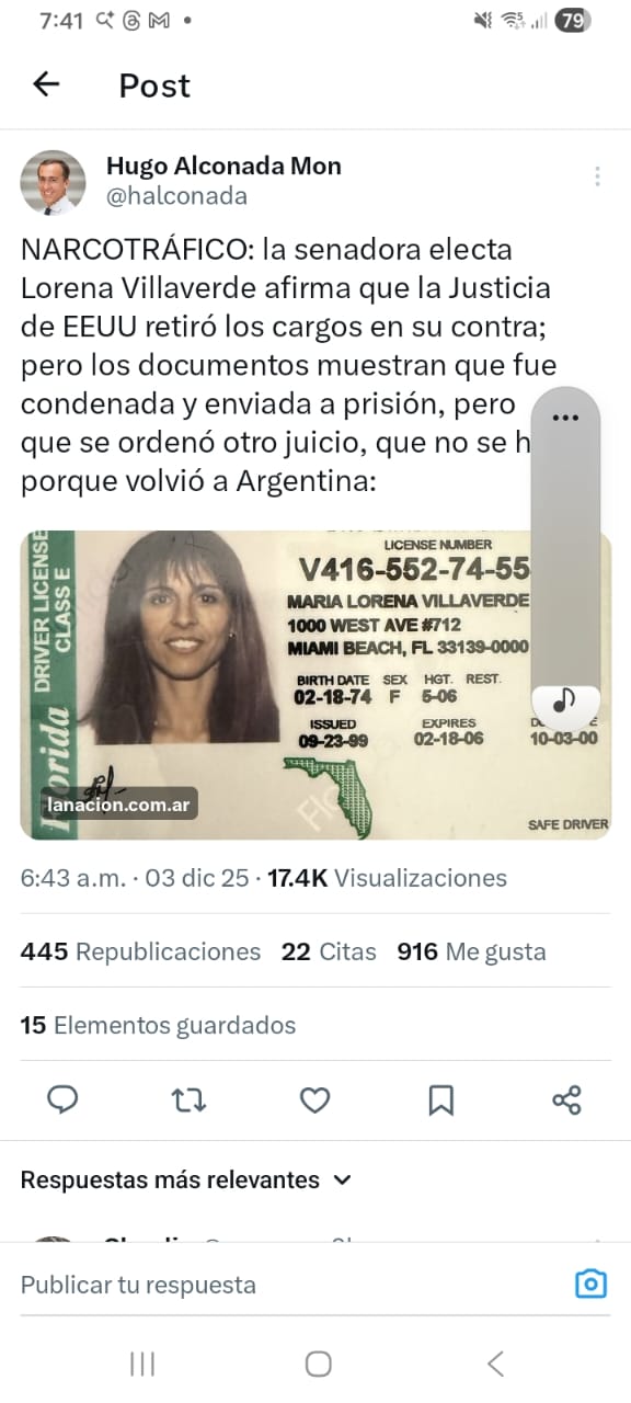 El posteo del Periodista Hugo Alconada Mon, respecto de las causas por las que no se aceptó el pliego de la ahora renunciada Lorena Villaverde, su relación con el narcotráfico y las estadas fueron publicas por este medio y otros de la Patagonia.