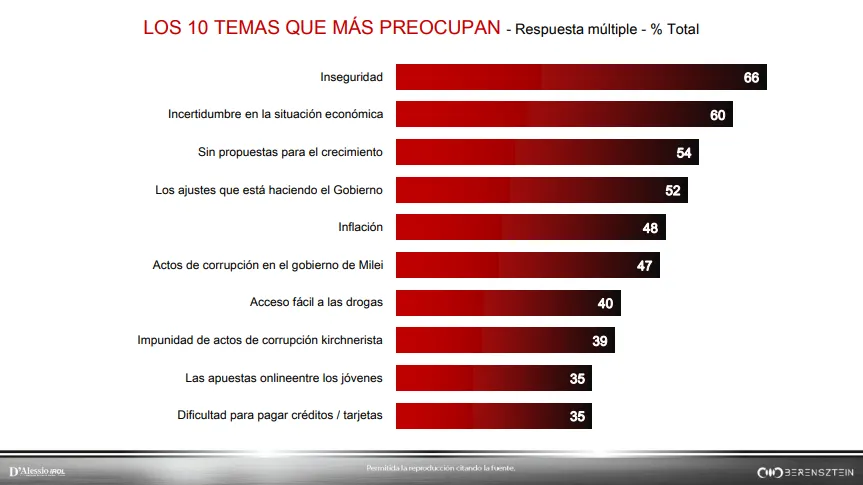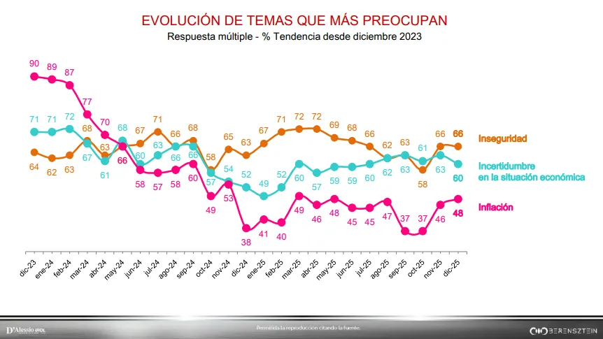 La inseguridad se consolida como la principal inquietud ciudadana, con un 66%, sin variaciones respecto del mes anterior. Le siguen: