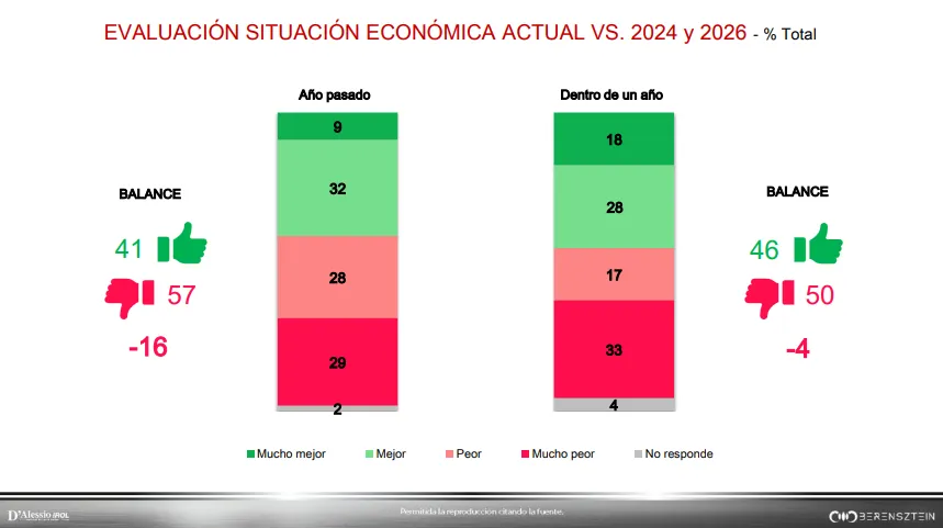 La evaluación sobre la situación económica actual se mantiene sin cambios respecto de noviembre. Un 57% de los encuestados considera que el país está peor que el año pasado, mientras que un 41% cree que está mejor.