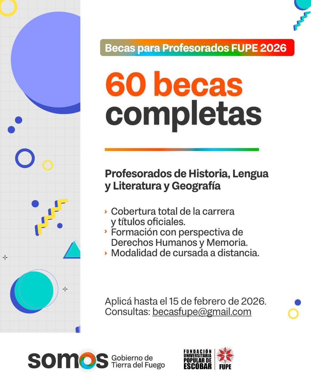Tierra del Fuego 30/01/2026.- El Gobierno Provincial abrió la convocatoria 2026 a 60 becas completas para cursar los profesorados de Historia, Lengua y Literatura y Geografía, con títulos oficiales y formación con perspectiva de Derechos Humanos y Memoria.