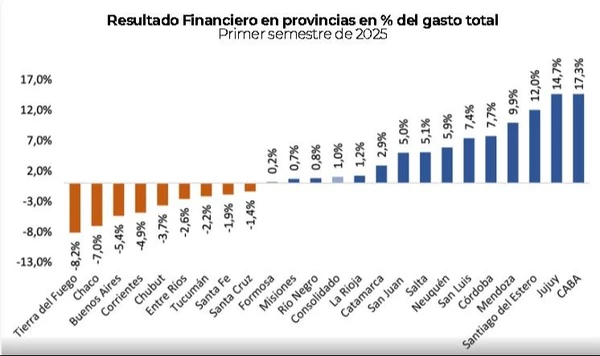El gráfico del resultado financiero provincial toma mayor relevancia en este contexto: muestra que las provincias deficitarias alcanzaron desequilibrios de hasta -8 % de su gasto total, como en Tierra del Fuego, Chaco y Buenos Aires, en el primer semestre de 2025. Al mismo tiempo, algunas jurisdicciones —como CABA, Jujuy, Santiago del Estero, Mendoza, Córdoba, Salta, San Luis y San Juan— presentaron resultados positivos, indicando que lograron mantener superávits o balances más sólidos.