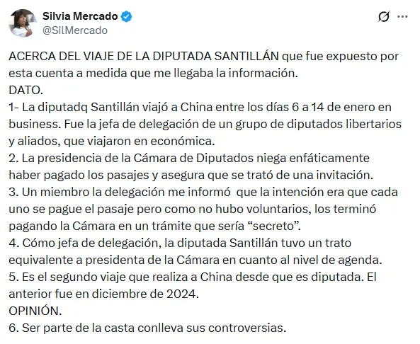 El episodio estalló luego de que Mercado compartiera un video en redes sociales en el que se observa a la legisladora a bordo de un avión, acompañado de un mensaje que aludía directamente a sus vacaciones en el exterior junto a un grupo de dirigentes libertarios.