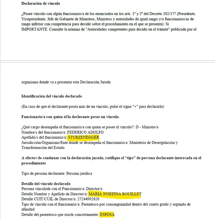 En los considerandos de la disposición, Cancillería dejó constancia de que, al analizar la Declaración Jurada de Intereses exigida por el Decreto 202/2017, surgió un “vínculo positivo” entre una autoridad de la entidad adjudicataria y un ministro nacional. La Oficina Anticorrupción incorporó un dictamen en el expediente que encuadró el vínculo como “familiar (matrimonio)” entre Sturzenegger y Rouillet.