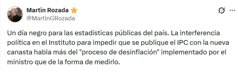 Rozada se muestra asombrado por la decisión del Gobierno de meterse en el Indec. Más aún porque, según sus cálculos, en enero, el IPC con la nueva medición hubiera estado entre 2,6% y 2,8%. O sea, muy parecido a lo que fue diciembre y en línea con los dichos de Luis Caputo que desmintió que el dato de enero (que se publicara el 10 de febrero) iba a dar arriba del 3% con la nueva metodología.