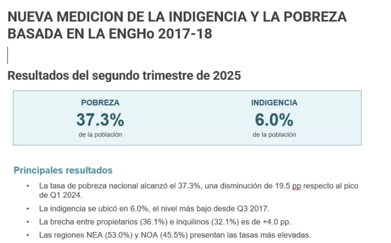 Basada enteramente en la Encuesta Nacional de Gastos de los Hogares (ENHGo) de 2017-18, la pobreza en segundo trimestre del 2025 (metodología ENGHo 2017-18) está en 37,3% contra el 31,9% del Indec. «Ambas series muestran la misma tendencia. La diferencia está en el nivel de la línea de pobreza», dice el economista de la Di Tella. Utilizando los datos actualizados y no la canasta que mantuvo el Gobierno, la caída de la pobreza sería de 19,5 puntos desde el pico del primer trimestre del 2024. Y la indigencia alcanzaría 6%, el nivel más bajo desde el tercer trimestre del 2017.