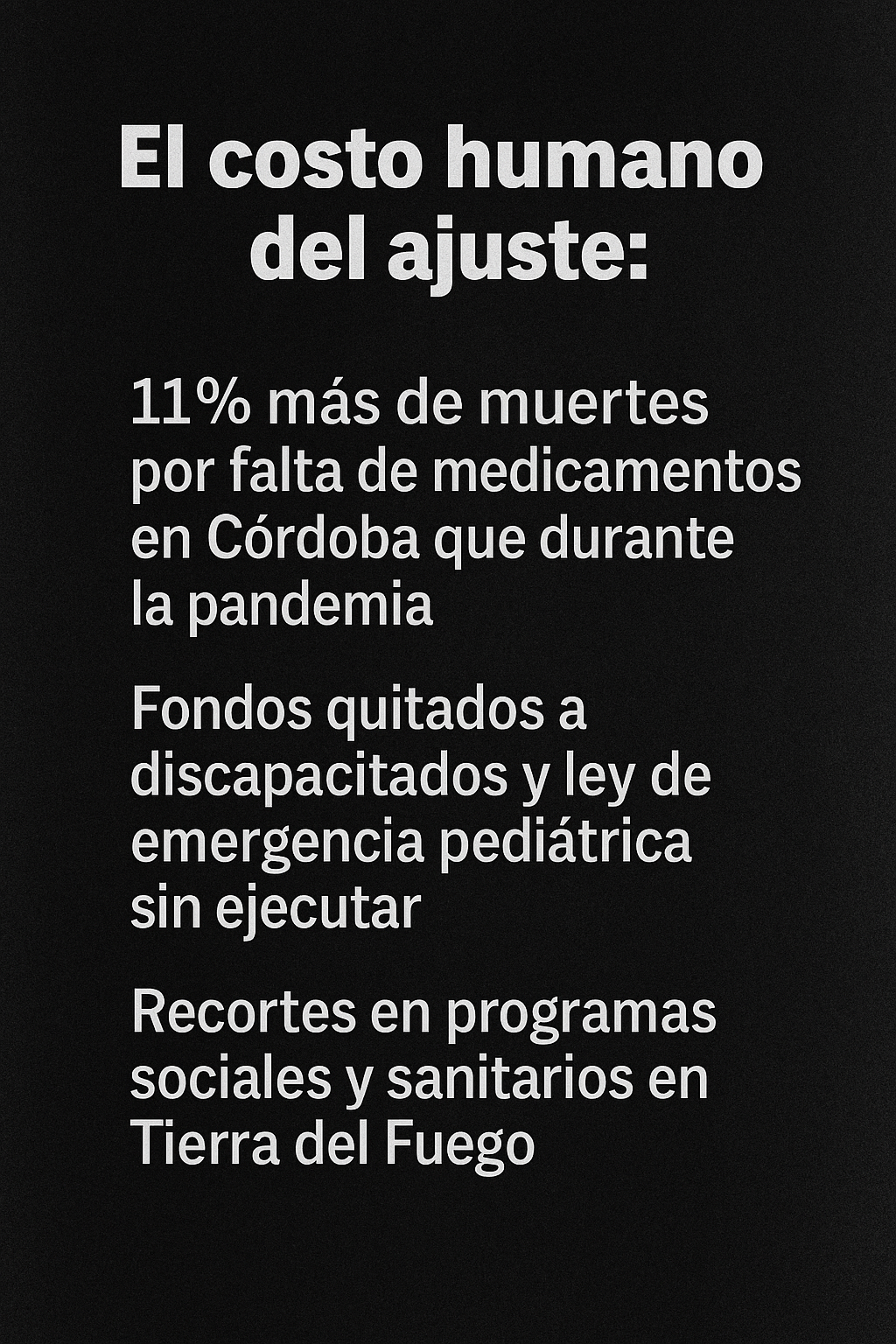 En Tierra del Fuego, el impacto se siente con igual crudeza. Los recortes en programas sociales y sanitarios han dejado a la provincia en una situación de extrema fragilidad: hospitales con recursos limitados, familias que no pueden acceder a tratamientos básicos y una creciente presión sobre los sistemas locales de asistencia. La distancia geográfica y las dificultades logísticas propias de la región profundizan aún más las consecuencias del ajuste, generando un escenario donde la falta de medicamentos y de apoyo estatal se traduce en muertes evitables y en un deterioro acelerado de la calidad de vida.