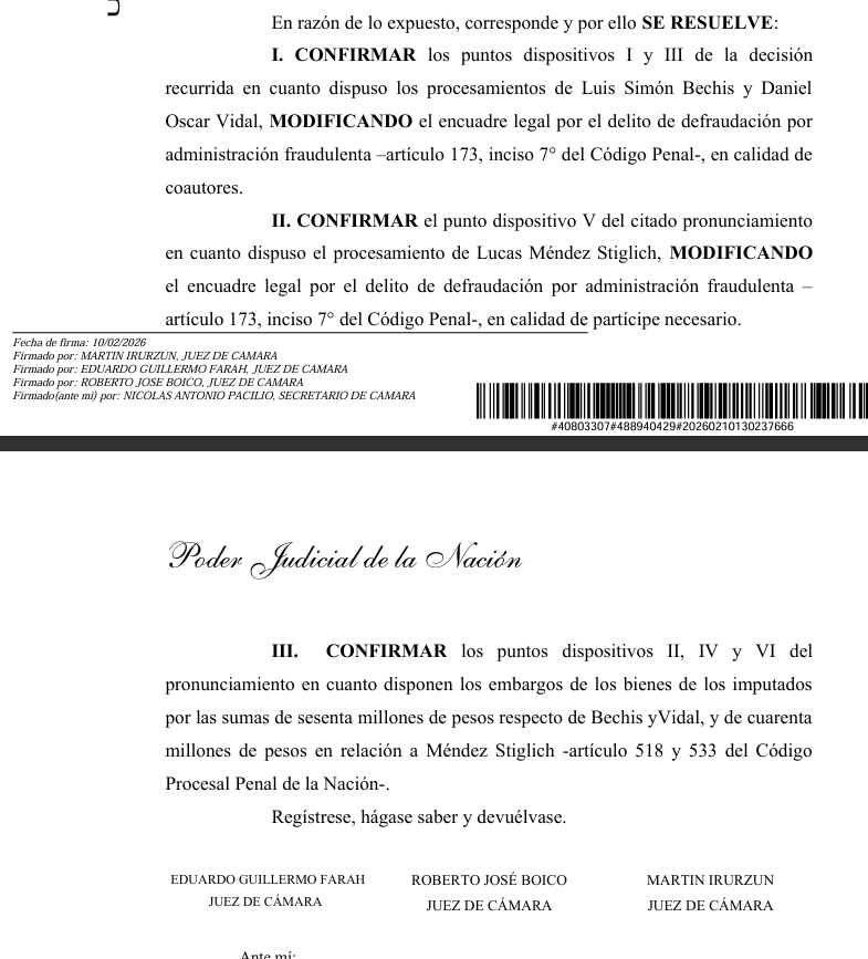 En su resolución el Tribunal resolvió: “I. CONFIRMAR los puntos dispositivos I y III de la decisión recurrida en cuanto dispuso los procesamientos de Luis Simón Bechis y Daniel Oscar Vidal, MODIFICANDO el encuadre legal por el delito de defraudación por administración fraudulenta –artículo 173, inciso 7° del Código Penal-, en calidad de coautores. I. CONFIRMAR el punto dispositivo V del citado pronunciamiento en cuanto dispuso el procesamiento de Lucas Méndez Stiglich, MODIFICANDO el encuadre legal por el delito de defraudación por administración fraudulenta – artículo 173, inciso 7° del Código Penal-, en calidad de partícipe necesario. III. CONFIRMAR los puntos dispositivos II, IV y VI del pronunciamiento en cuanto disponen los embargos de los bienes de los imputados por las sumas de sesenta millones de pesos respecto de Bechis y Vidal, y de cuarenta millones de pesos en relación a Méndez Stiglich -artículo 518 y 533 del Código Procesal Penal de la Nación-.”