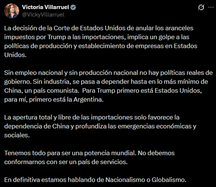 La vicepresidenta Victoria Villarruel dejó este viernes un mensaje en su cuenta de X tras la decisión de la Corte de Estados Unidos de anular aranceles a las importaciones y sostuvo que “sin empleo nacional y sin producción nacional no hay políticas de producción”.