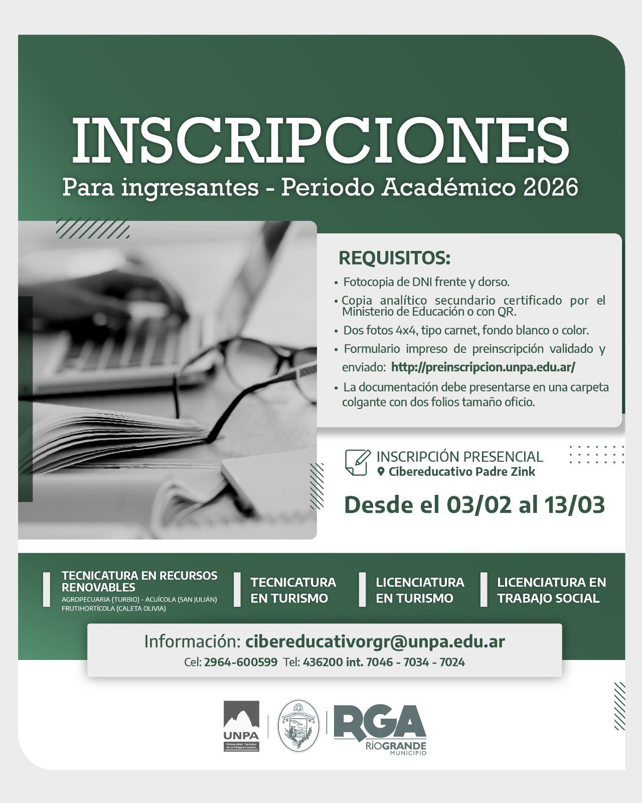 Quienes deseen iniciar sus estudios deberán presentar fotocopia del DNI (frente y dorso), copia del analítico secundario certificado por el Ministerio de Educación o con código QR, dos fotografías tipo carnet 4×4 y el formulario de preinscripción impreso, validado y enviado previamente a través del sitio web: http://preinscripcion.unpa.edu.ar/. Toda la documentación deberá entregarse en una carpeta colgante con dos folios tamaño oficio.